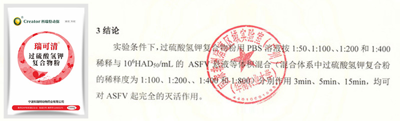 1、 生物安全措施之消毒:科瑞特的過硫酸氫鉀復(fù)合物粉“瑞可清“與戊二醛制劑”金戊迪“,均為對非洲豬瘟病毒有良好的殺滅效果。