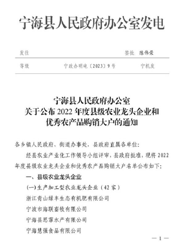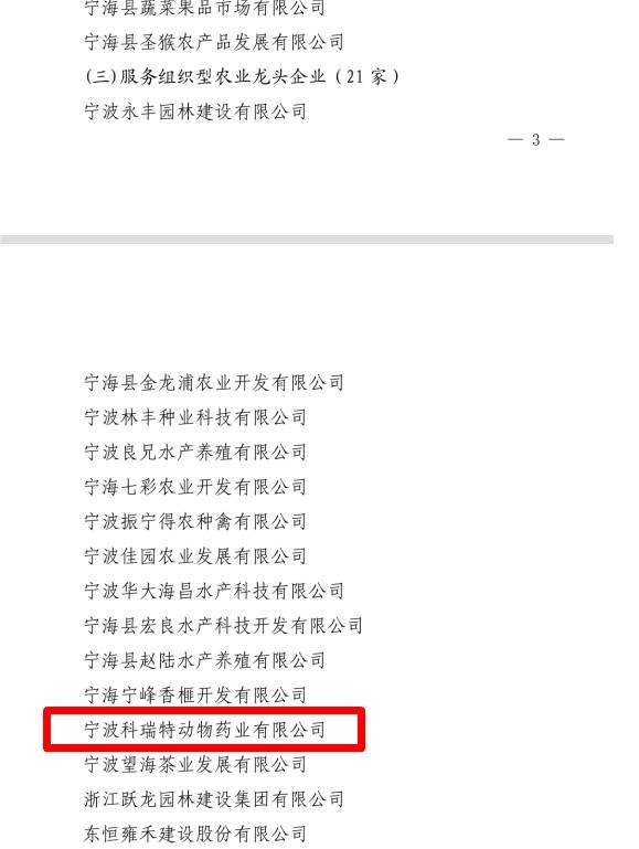 近日,經(jīng)縣農(nóng)業(yè)產(chǎn)業(yè)化工作領(lǐng)導(dǎo)小組評(píng)審,縣政府批準(zhǔn),寧波科瑞特動(dòng)物藥業(yè)有限公司榮獲“2022年度縣級(jí)農(nóng)業(yè)龍頭企業(yè)”稱(chēng)號(hào)。