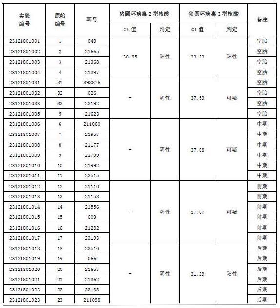 除了空胎有一組混合樣PCV-2抗原陽性(C/T值為30.85),其它各混合樣均為陰性,說明PCV-2也不是主要病因。